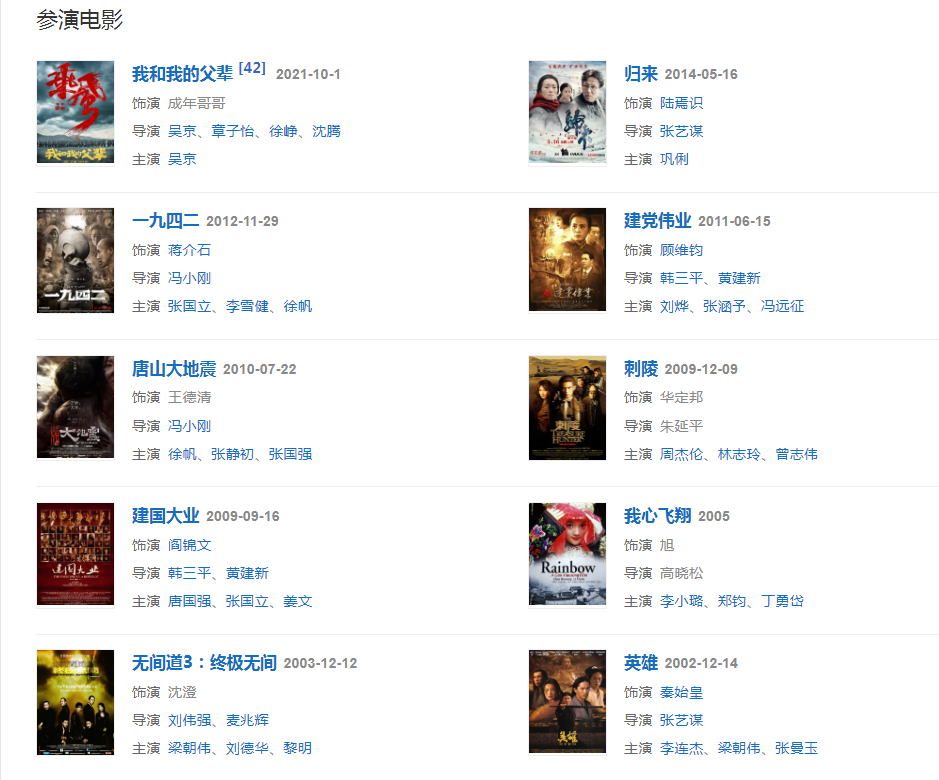 代表作品:庆余年、寇老西儿、末代皇帝、围城、康熙王朝、我的1919、唐山大地震、我心飞翔、楚汉传奇、归来、一九四二、长征