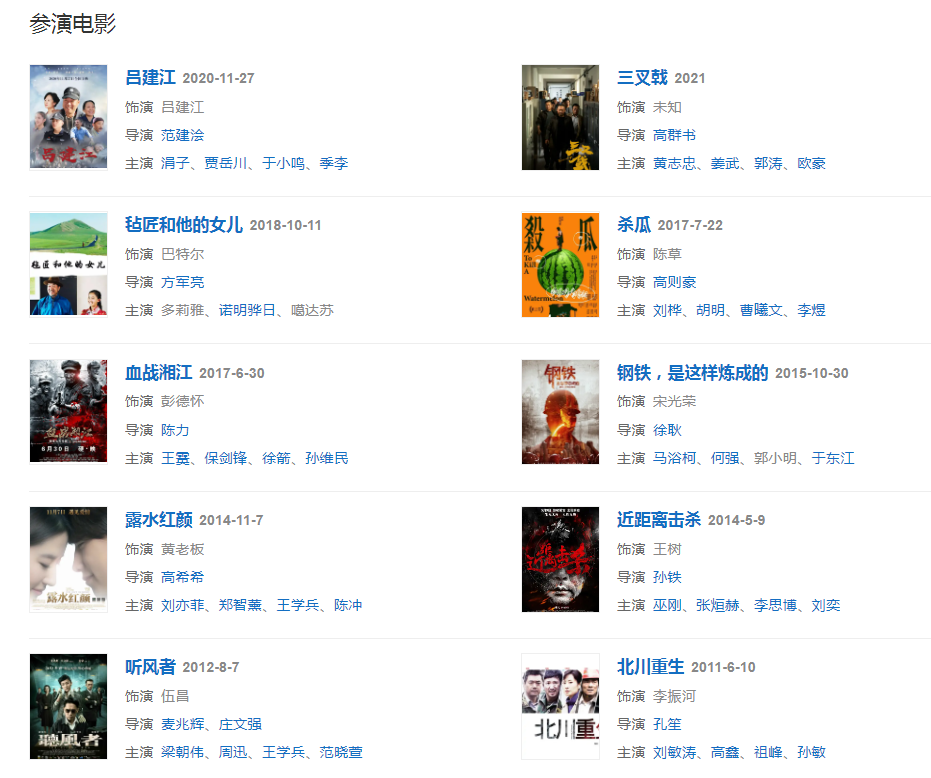 代表作品:警坛风云、重案六组、重庆谍战、谍变1939、霍元甲、北平无战事、彭德怀元帅