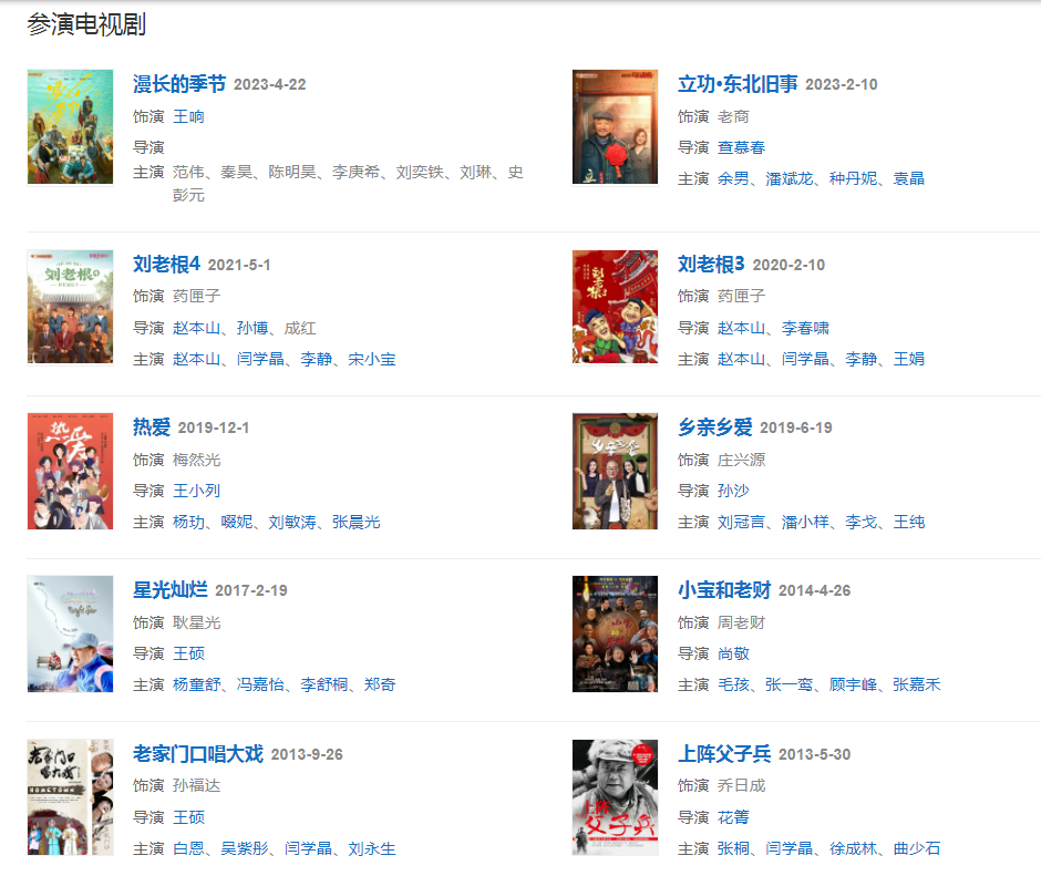 代表作品:刘老根、马大帅、跟踪孔令学、南京!南京!、老大的幸福、小宝和老财、耳朵大有福、即日启程