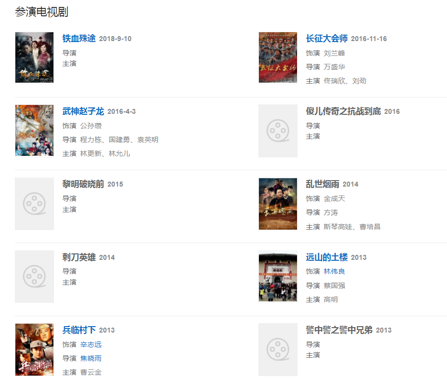 2012年参演《决战燕子门》饰演鬼面掌门人“东方白”。