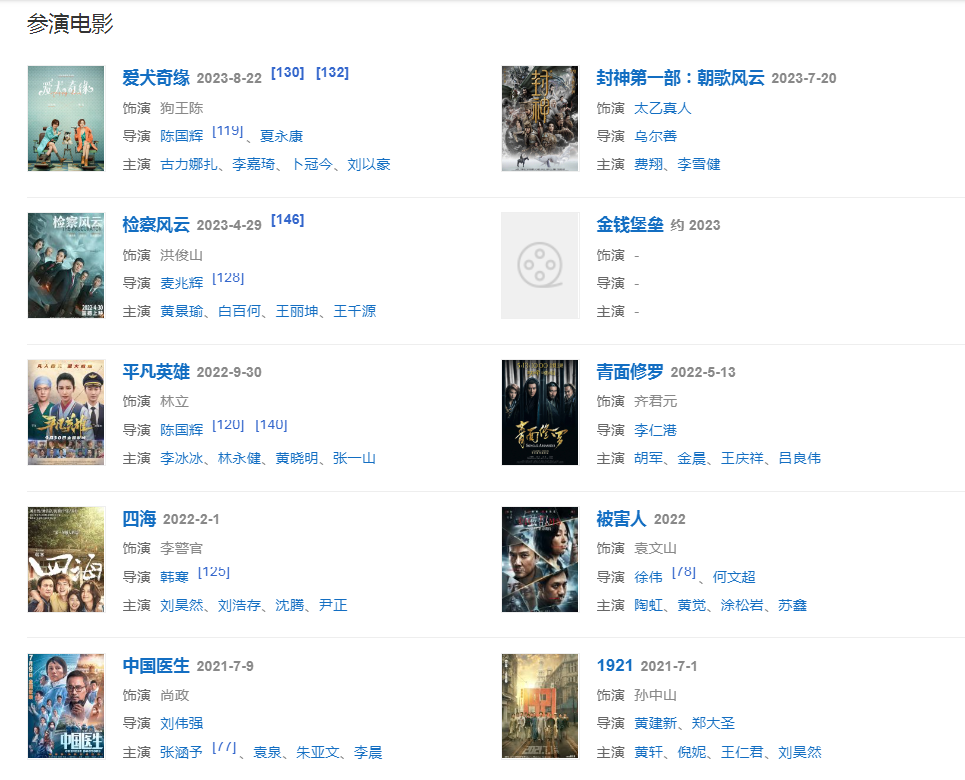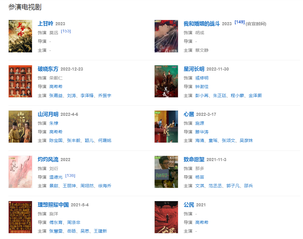 代表作品:宫锁心玉、鸿门宴传奇、狼图腾、后会无期、知否知否应是绿肥红瘦、兰陵王、狄仁杰之神都龙王、黄金时代