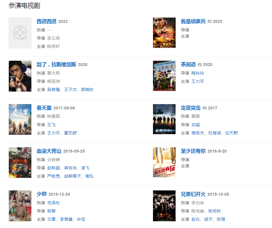 代表作品:中国1921、喋血1941、恰同学少年、我是特种兵、武工队传奇、兵出潼关、战火西北狼