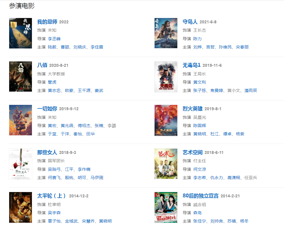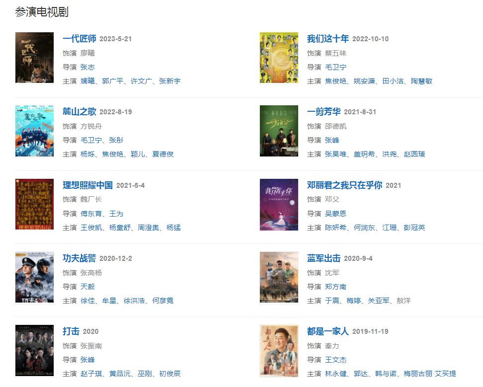 代表作品:都是一家人、巡回检察组、人民的名义、烈火英雄、冲出亚马逊、大染坊、大秦帝国、陈赓大将