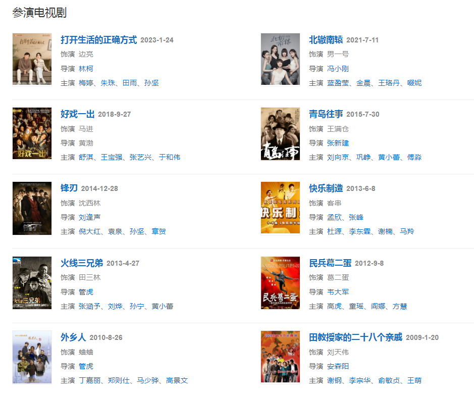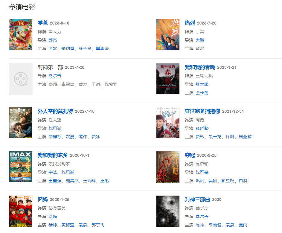 代表作品:夺冠、冰之下、一出好戏、疯狂的外星人、斗牛、杀生、疯狂的石头、心花路放、亲爱的、民兵葛二蛋、锋刃、泰囧、正义之道、临时演员、男人好难、这就是命