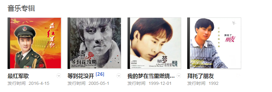 江涛论外形不输很多新人歌手,真是名符其实的歌坛“常青树”,而其歌坛中少有的硬汉气质和霸气的演唱风格更是独树一帜。在歌坛打拼多年,江涛积累了很高的知名度,也有不少的传唱好歌。