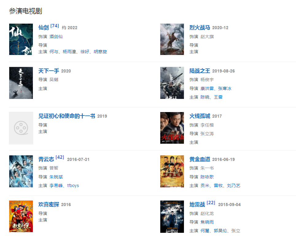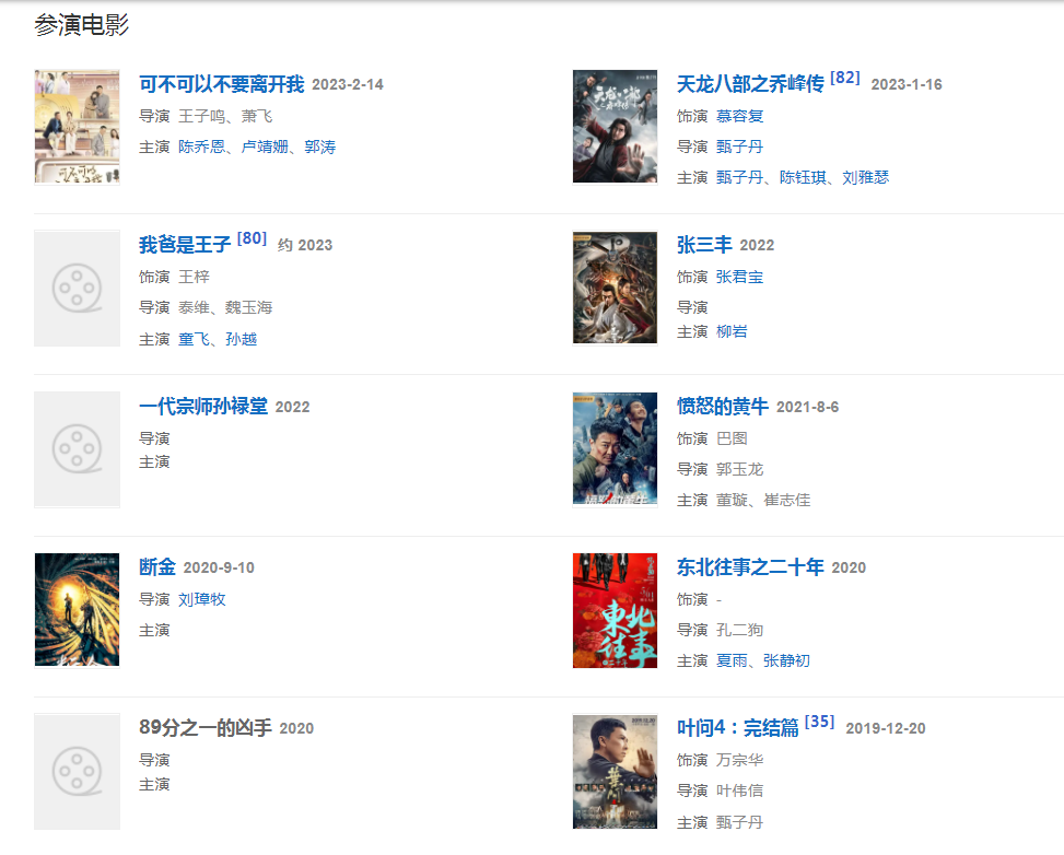 代表作品:地下交通站、西游记、浪子燕青、连城诀、寒战2、建军大业、狂兽、英雄本色4、叶问4:完结篇