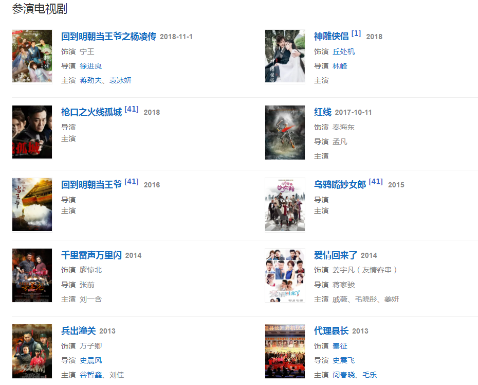 2016年主演古装剧《赢天下》和《回到明朝当王爷之杨凌传》。