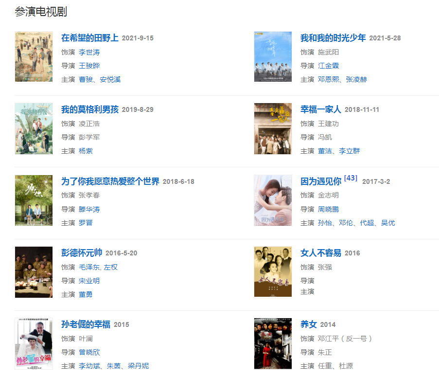 2018年在滕华涛指导电视剧《为了你我愿意热爱整个世界》中,饰演张孝春;同年出演冯凯执导的家庭剧《幸福一家人》。