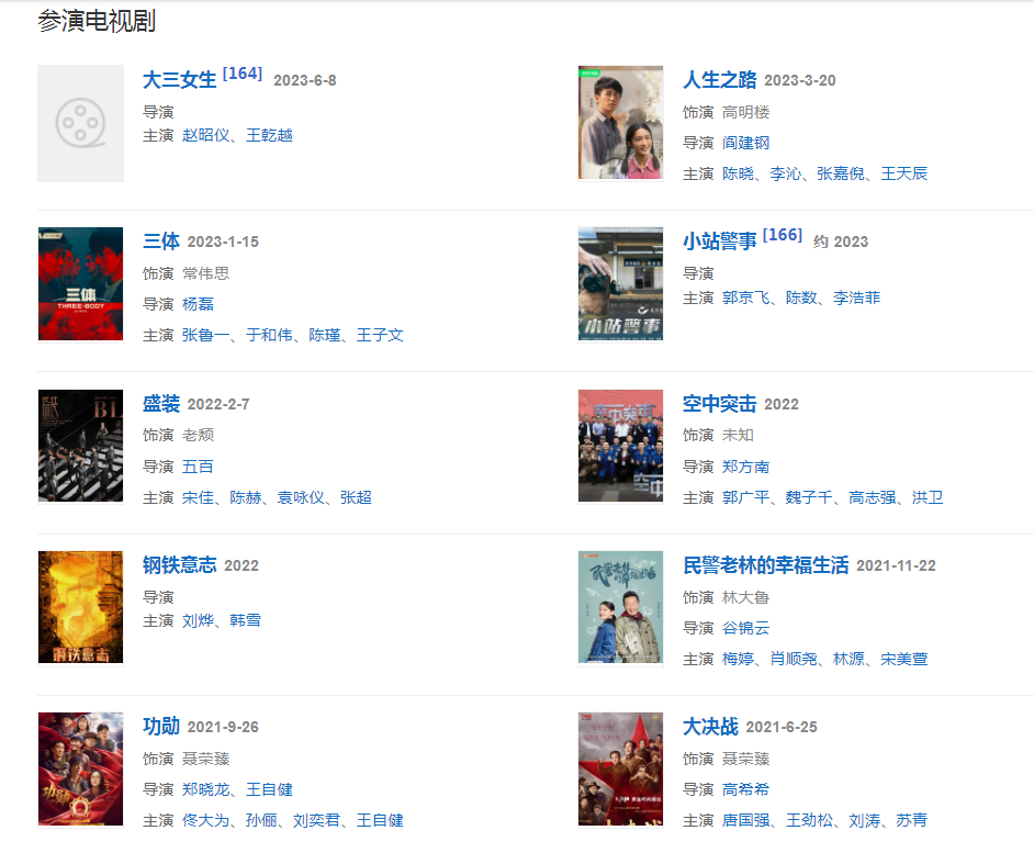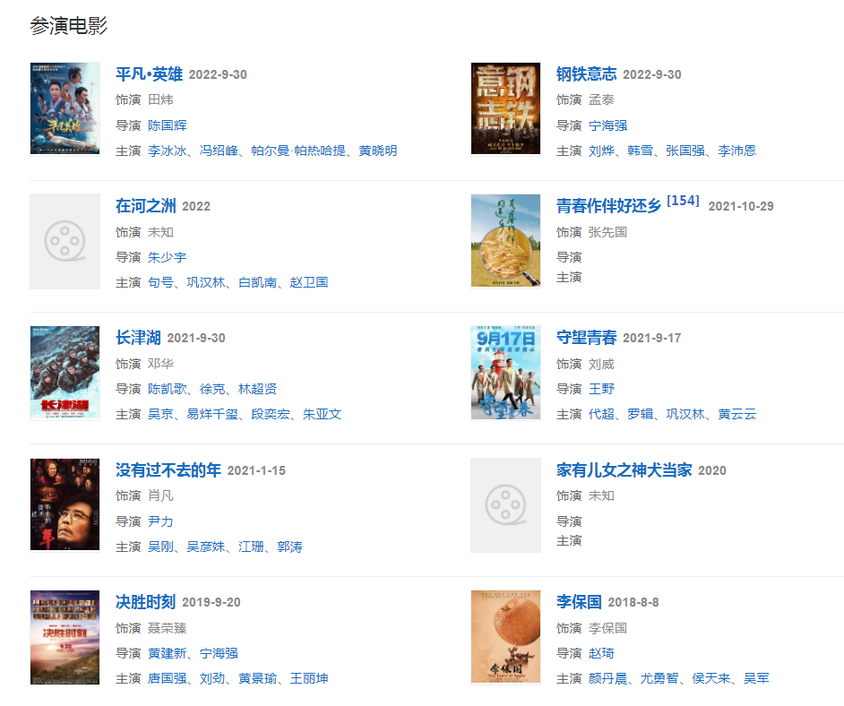 代表作品:王贵与安娜、喜耕田的故事、林师傅在首尔、黎明之前、妈妈像花儿一样、聂荣臻、左轮手枪