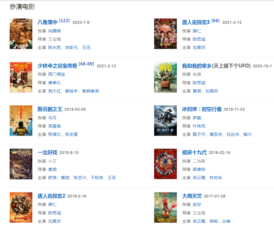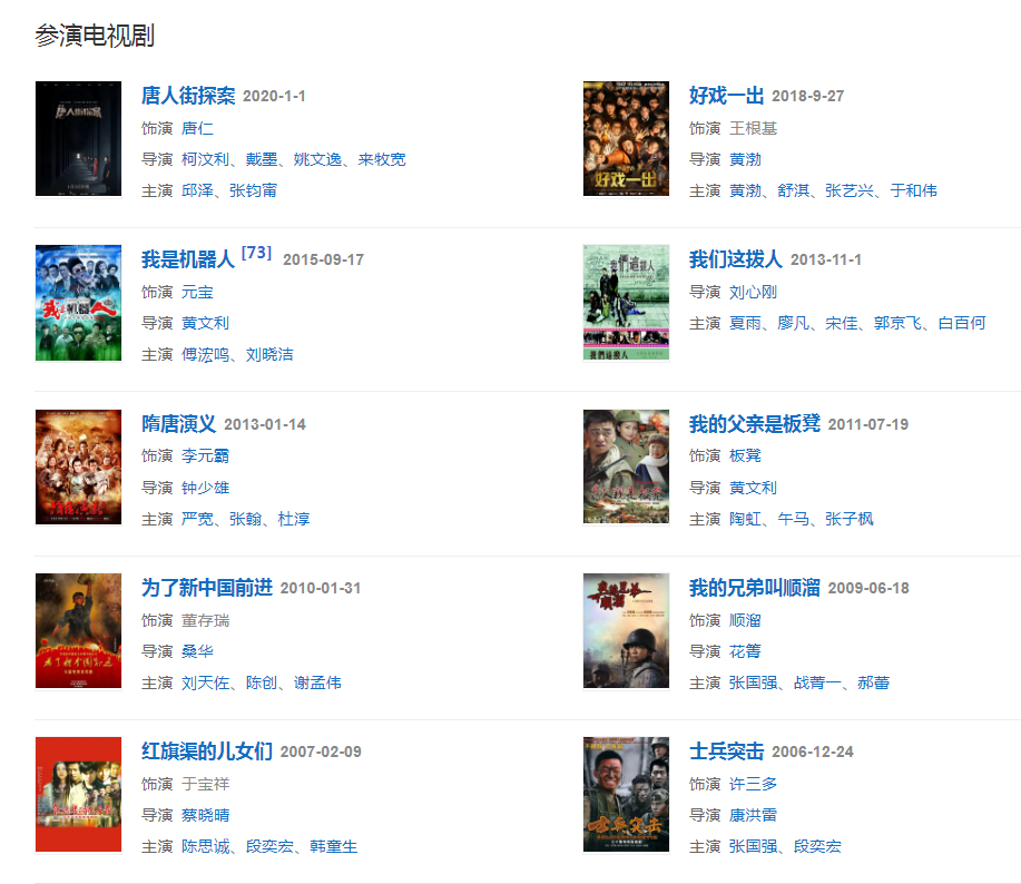 代表作品:士兵突击、我的兄弟叫顺溜、人在囧途、唐人街探案、盲井、道士下山、人再囧途之泰囧、Hello!树先生、一个人的武林
