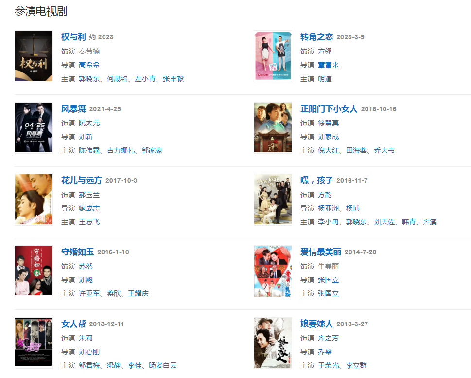 代表作品:牵手、女帅男兵、立春、金婚、幸福来敲门、我们天上见、娘要嫁人、爱情最美丽、守婚如玉