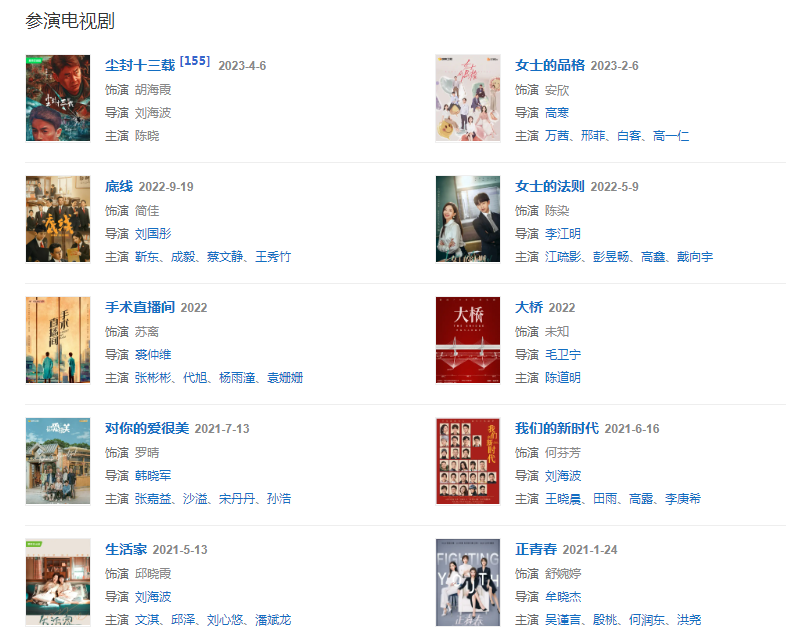 代表作品:湄公河大案、琅琊榜、伪装者、因为遇见你、欢乐颂、带着爸爸去留学、精英律师