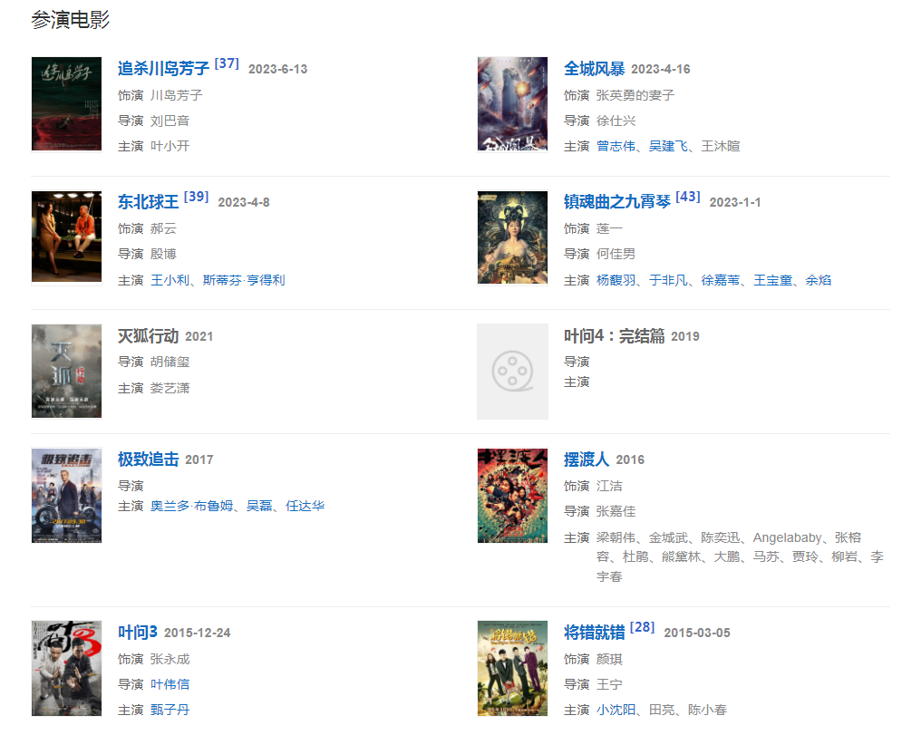 代表作品:叶问、我的野蛮女友2、拜金女王、摆渡人