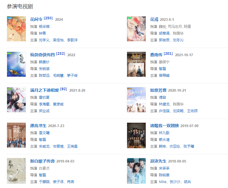 代表作品:芸汐传、新白娘子传奇、请赐我一双翅膀、如意芳霏、漂亮书生、热血长安、花戎