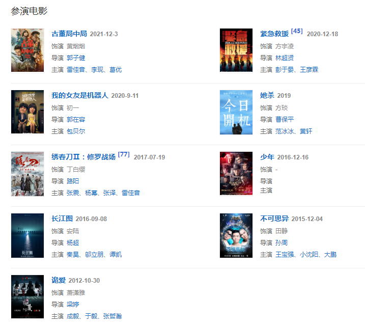 代表作品:怒晴湘西、长江图、绣春刀Ⅱ:修罗战场、如懿传、庆余年、带着爸爸去留学、恋爱先生