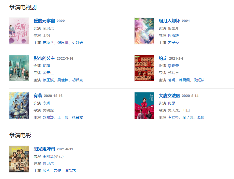 2020年2月,主演古装悬疑剧《大唐女法医》;12月,主演古装武侠剧《有翡》。