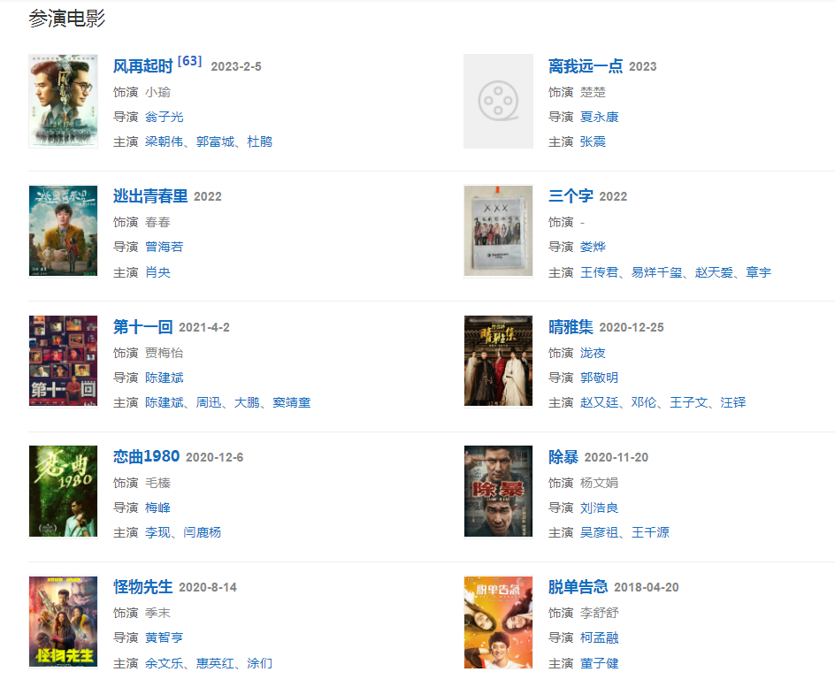 2023年1月21日,参加《2023年中央广播电视总台春节联欢晚会》,出演微电影《我和我的春晚》;2月5日,特别演出的电影《风再起时》上映。