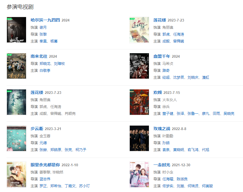 代表作品:知否知否应是绿肥红瘦、长安十二时辰、艳骨、金枝玉叶、扶摇、一念时光、哈尔滨一九四四 、莲花楼