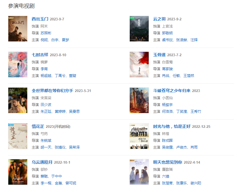 代表作品:云之羽、全世界都在等你们分手、玉骨遥、时光与他,恰是正好、惜花芷、西出玉门