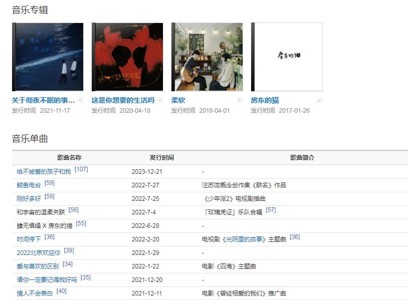 2017年,推出组合首张同名专辑《房东的猫》 ;同年,为动漫番剧《我是江小白》演唱片尾曲《云烟成雨》 。