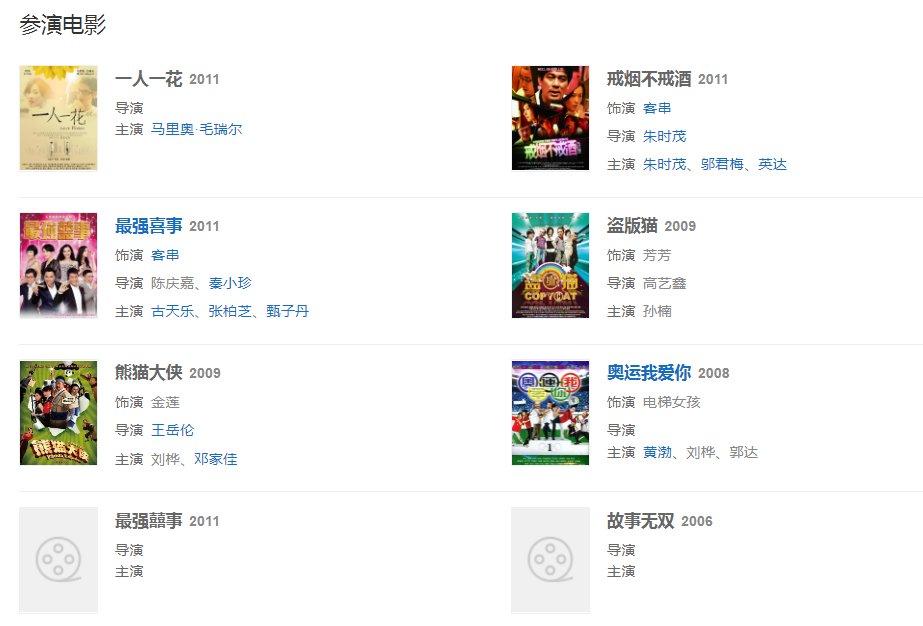 2009年,主演古装喜剧电影《熊猫大侠》,并演唱插曲《叹金莲》。