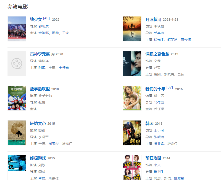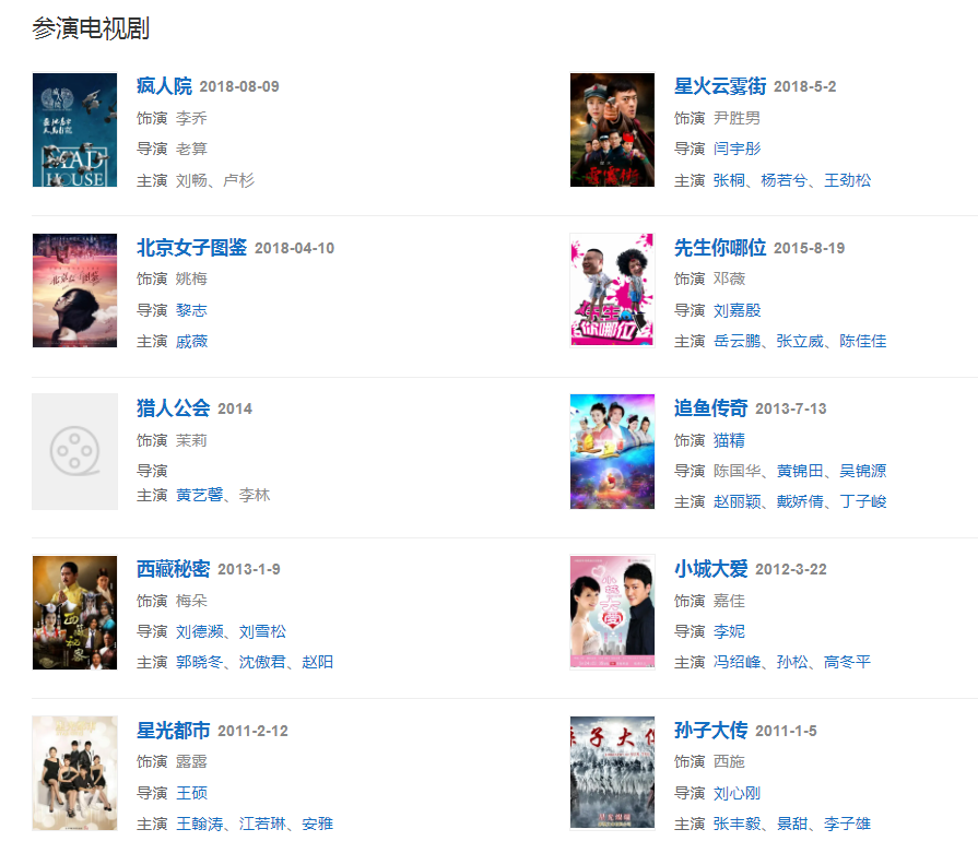 代表作品:前任攻略、我们的十年、脱轨时代、轩辕大帝、小城大爱、西藏秘密、疯人院、北京女子图鉴