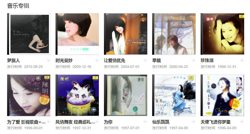 自九十年代初步入歌坛,陈明作为国内的第一批签约歌手,在亲历了中国原创流行音乐的数载沉浮后,至今仍是音乐界活跃的实力派歌手之一。无论是卡带盛行的年代,还是网络下载的今天,她的作品都同时拥有着傲人的销量和极高的流行性与传唱度。