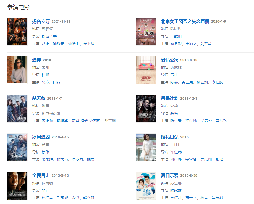 2013年,参演犯罪悬疑电影《全民目击》,并凭借该片获得第32届大众电影百花奖最佳女配角奖。