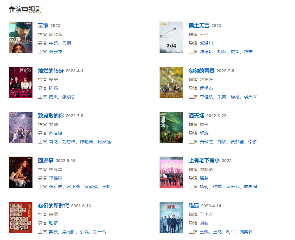 代表作品:爱情公寓Ⅱ、全民目击、无证之罪、大明风华、扬名立万、回廊亭、十全九美