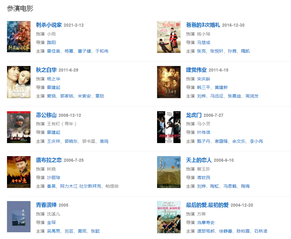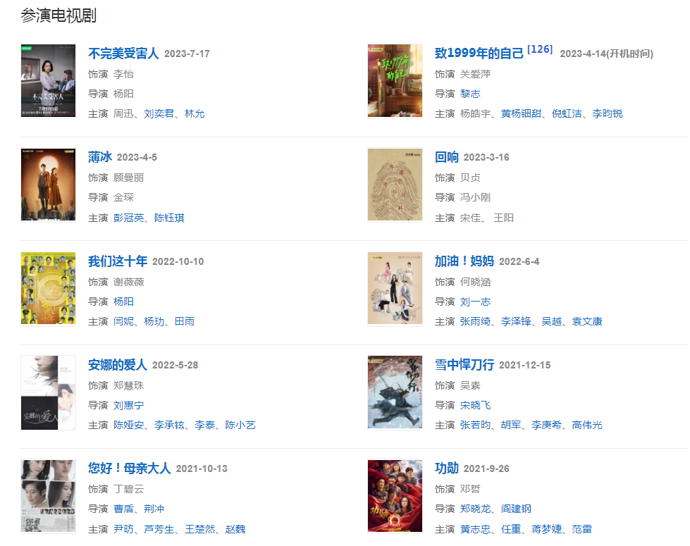 代表作品:金粉世家、天若有情、相爱十年、梁山伯与祝英台、幸福一家人、如懿传、幸福时光、地下铁、龙虎门