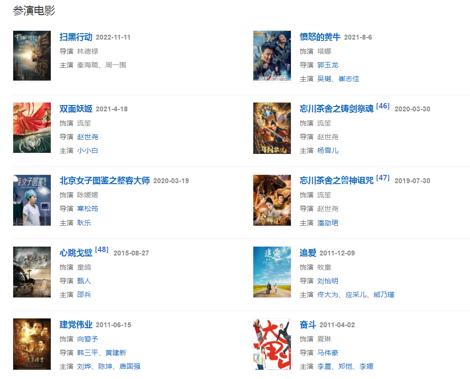 2008年,凭借剧情片《立春》提名第27届金鸡奖最佳女配角奖;同年,她还主演古装武侠剧《八大豪侠》。