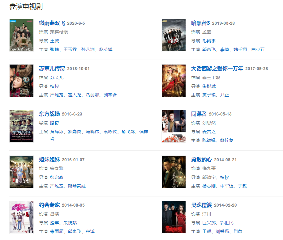 代表作品:铁梨花、灵魂摆渡、红娘子、胜女的代价、刑名师爷、勇敢的心、血誓、恋了爱了