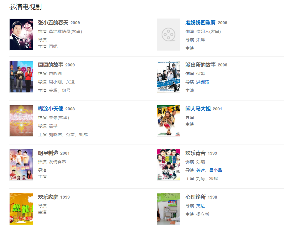 1993年,在中国第一部情景喜剧《我爱我家》中饰演贾圆圆而走红,之后客串多部情景剧《闲人马大姐》《明星制造》《中国餐馆》《心理诊所》《欢乐家庭》。
