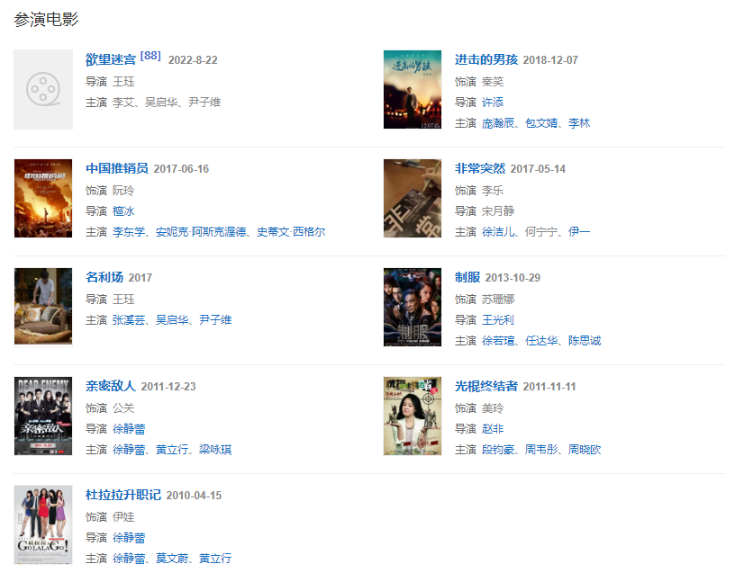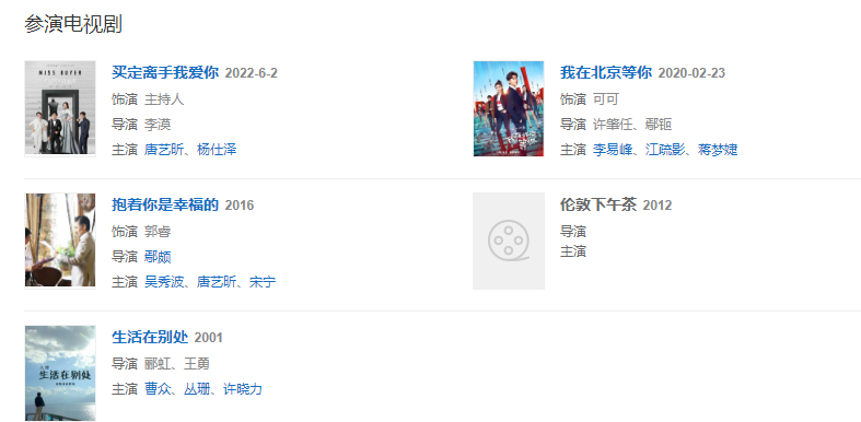 代表作品:幸福晚点名、杜拉拉升职记、我爱我家、星跳水立方、亲艾的衣橱、中国推销员、非常突然