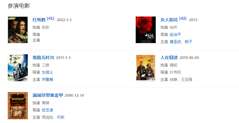 2006年,出演张艺谋执导的古装片《满城尽带黄金甲》,凭借该片提名金鸡百花电影节最佳新人奖,获得“贺岁十年欢乐盛典”最受欢迎电影女配角奖。