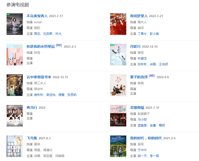 2021年6月3日,出演的青春能量剧《飞鸟集》在腾讯视频和芒果TV播出,在剧中饰演夏菲;同年,出演胡一天、胡冰卿主演的《暗恋橘生淮南》,饰演盛淮南妈妈,在电视剧《我的时代,你的时代》饰演吴白妈妈; 7月11日,参演的电视剧《北辙南辕》播出。