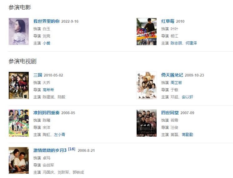 2009年,出演古装剧《三国》饰演大乔;同年,她因在古装武侠剧《倚天屠龙记》中饰演周芷若而获得更多关注。