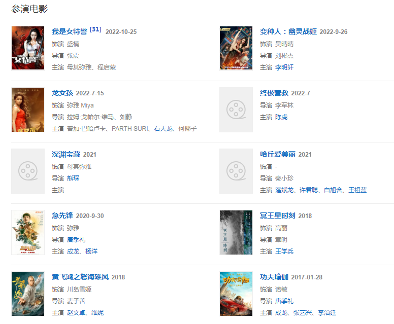 母其弥雅在电影《功夫瑜伽》中,因其魔鬼的身材和瑜伽戏份受到了观众的好评;而她也凭借其精湛的瑜伽技巧赢得了众多观众的目光。母其弥雅在电影中的打戏部分,也表现的也酷劲十足,不但动作轻盈,而且具有杀伤力。母其弥雅的瑜伽术十分吸睛,成为了一抹亮眼的存在。