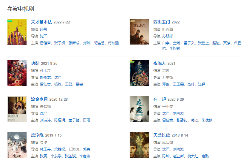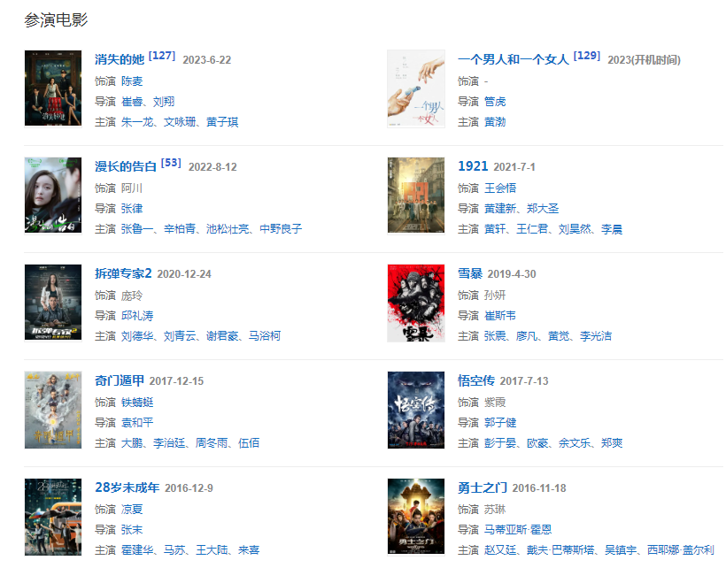 代表作品:金陵十三钗、流金岁月、幺幺洞捌、拆弹专家2、天盛长歌、宸汐缘、匆匆那年