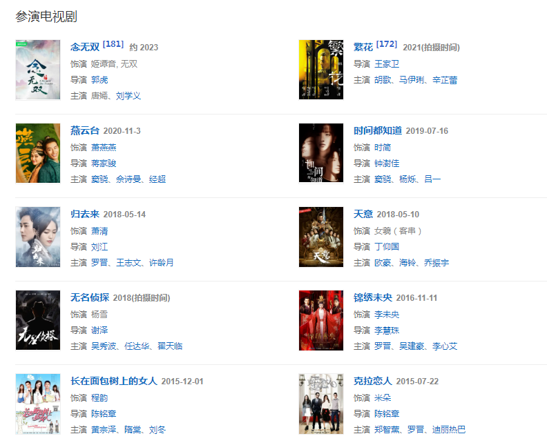 代表作品:仙剑奇侠传三、何以笙箫默、锦绣未央、夏家三千金、金玉良缘、X女特工、乱世佳人