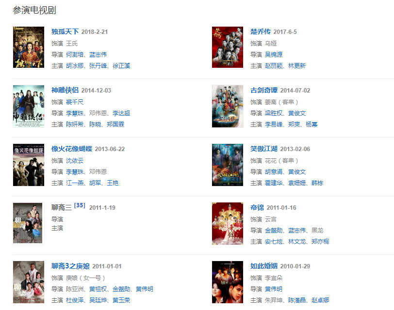 2002年出演古装神话剧《齐天大圣孙悟空》。2004年出演古装奇幻剧《仙剑奇侠传》 。