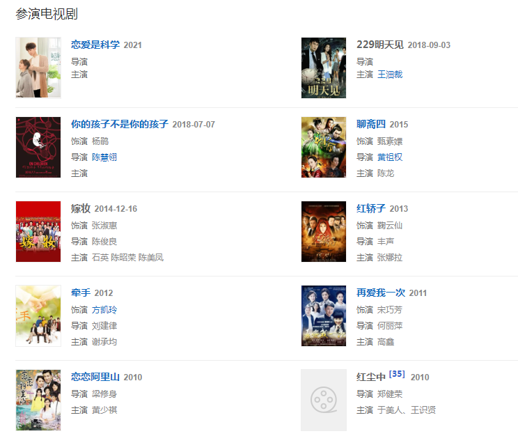 2011年,出演何丽萍执导的情感类电视连续剧《再爱我一次》,在片中饰演了一名单纯、乐观、隐忍、善良的妻子宋巧芳。2012年,出演刘建律执导的剧情类的电视剧《牵手》。