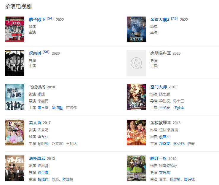 代表作品:银狐、豪门、戏王之王、天地男儿、大唐双龙传、胜者为王Ⅲ王者之战、金枝欲孽2、缘来自有机、街市的童话