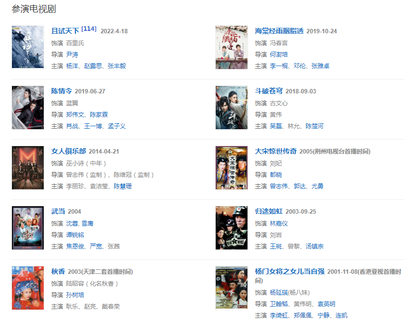 2001年,在古装作品《杨门女将》中饰演女主角杨延琪。