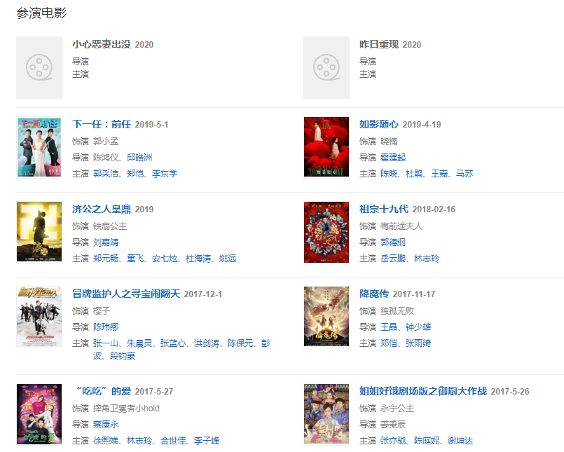 2015年出演的穿越偶像周播剧《相爱穿梭千年》于2月在湖南卫视播出, 2015年,出演神话电影《济公》扮演铁扇公主。