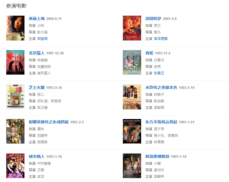 代表作品:倩女幽魂、青蛇、美丽上海、游园惊梦、东方不败风云再起、赌神