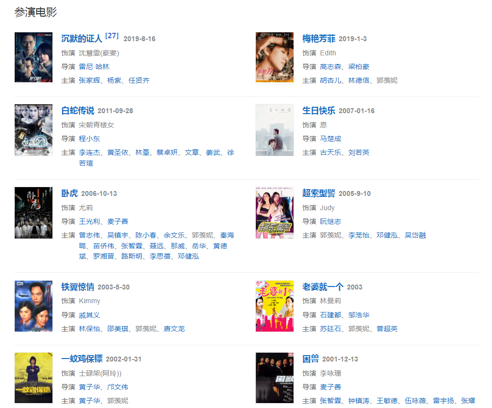 2001年,她与古天乐、宣萱、林峯等联袂出演TVB古装穿越科幻剧《寻秦记》,在剧中饰演两个角色一个是项少龙现代社会的女友秦青,另一是秦国才女琴清;同年,出演香港无线电视警匪剧《勇探实录》,在剧中饰演张国锋的前妻郑蕙玲。