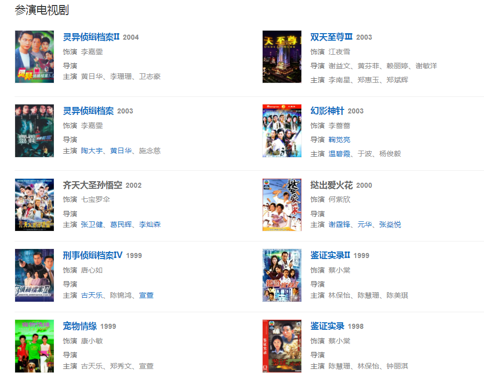 代表作品:鉴证实录、刑事侦缉档案IV、致命密函、江湖告急、五鼠斗御猫
