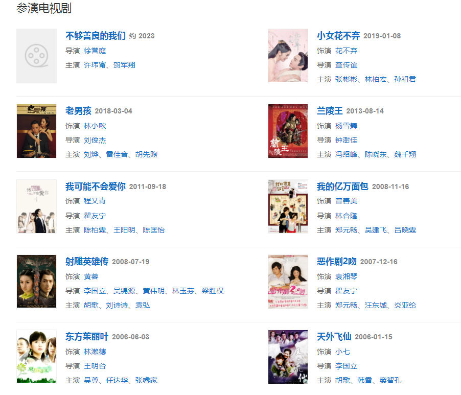 代表作品:恶作剧之吻、我可能不会爱你、天外飞仙、兰陵王、射雕英雄传、东方茱丽叶、老男孩、小女花不弃、孤单北半球、你、非你莫属