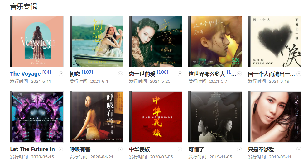 代表作品:忽然之间、他不爱我、如果没有你、盛夏的果实、电台情歌、爱、阴天、寂寞的恋人啊、慢慢喜欢你、没时间、宝贝、境外、头号粉丝、爱情、呼吸有害、这世界那么多人、大话西游、喜剧之王、食神、堕落天使